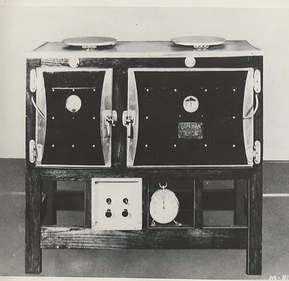 1914 model of the Copeman Electric Stove. Mostly wood, it had two ovens, top units, automatic timer (see clock) and heat control.