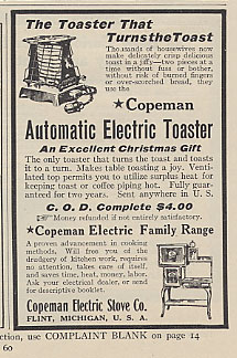 This is a Good Housekeeping Magazine, December, 1914 ad. It shows the toaster and the last model of the Copeman stove that was produced in Flint. This is the same model that later shows the Westinghouse name.