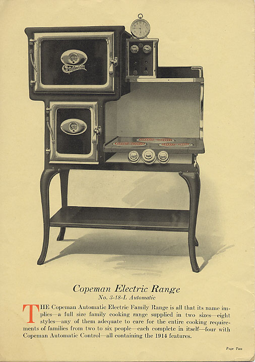 1915 (As this mentions the 1914 features, it must be the 1915 model.) This is the model that became the first Westinghouse range. The name Copeman was removed and the name Westinghouse was added.